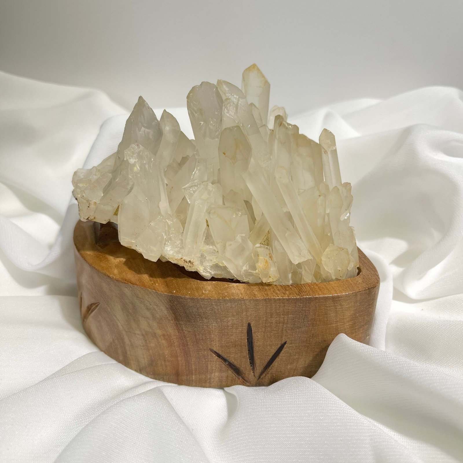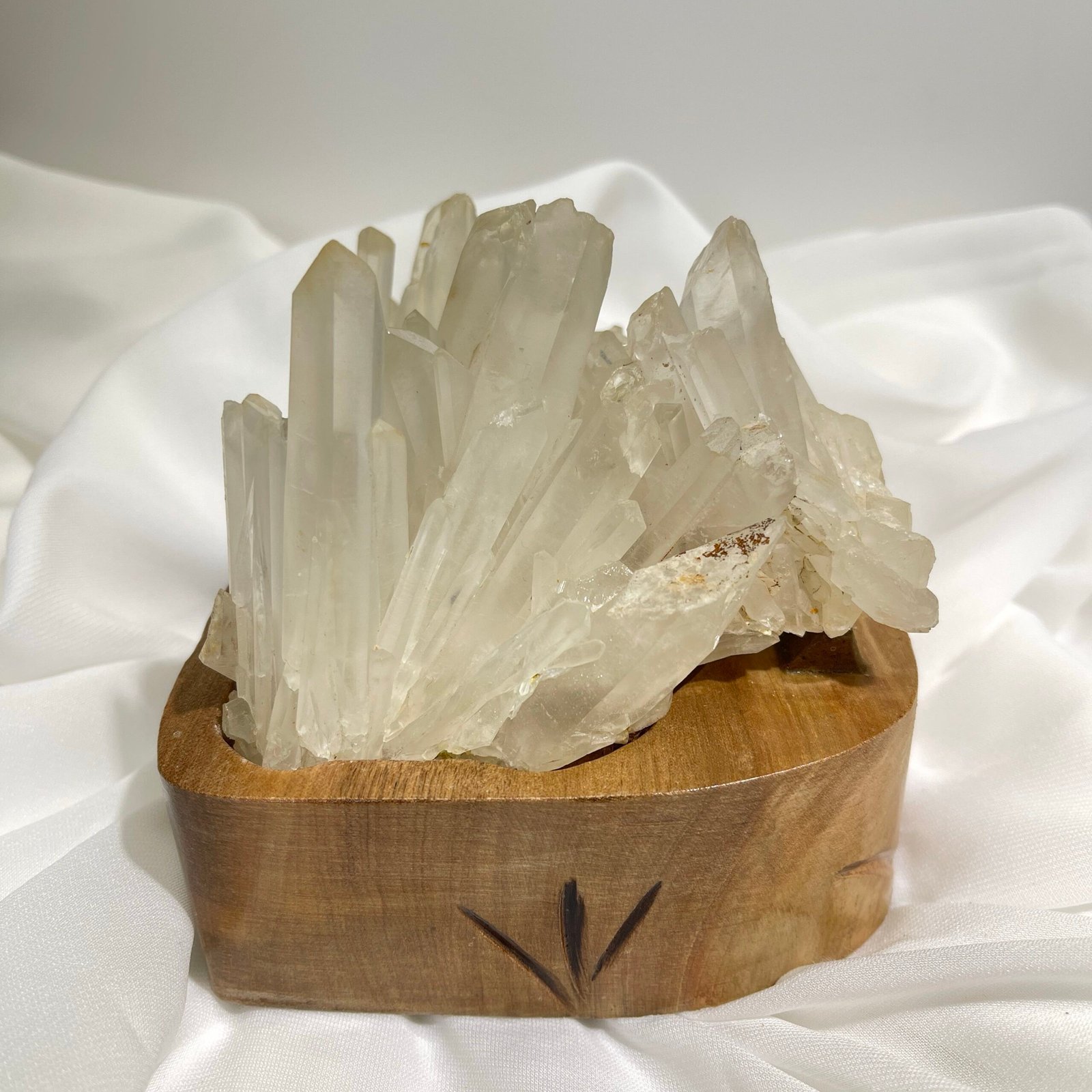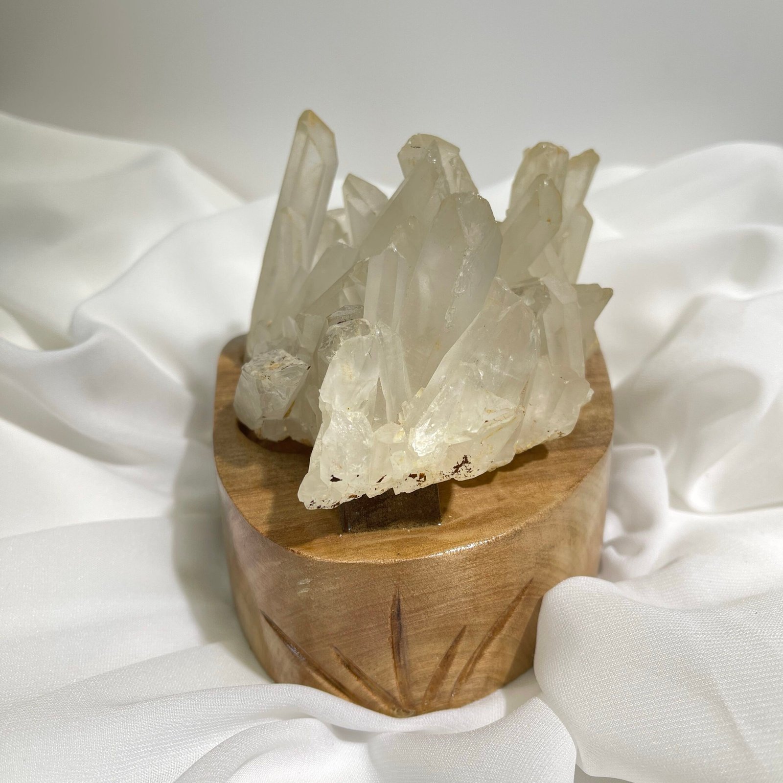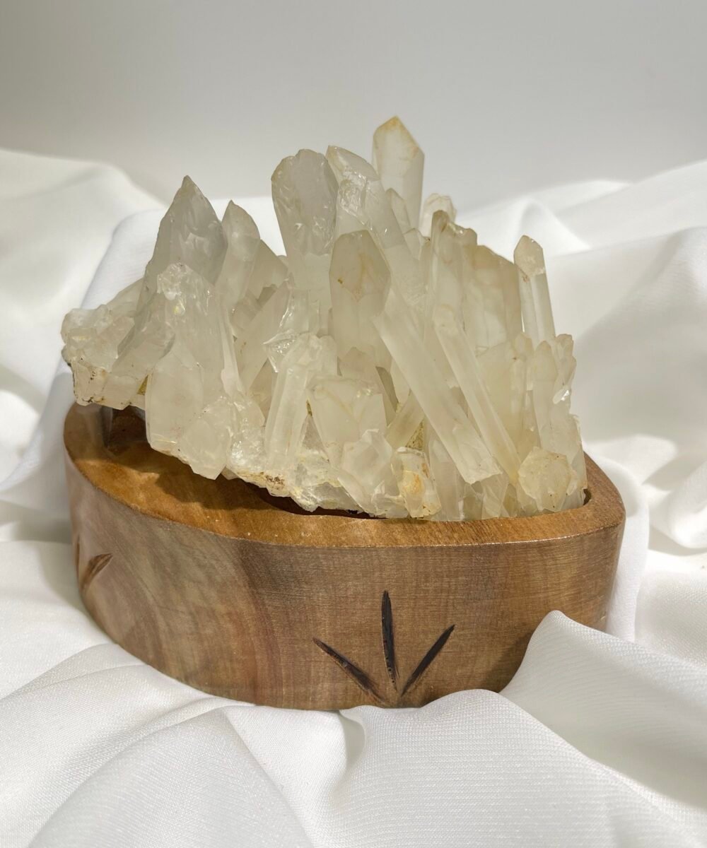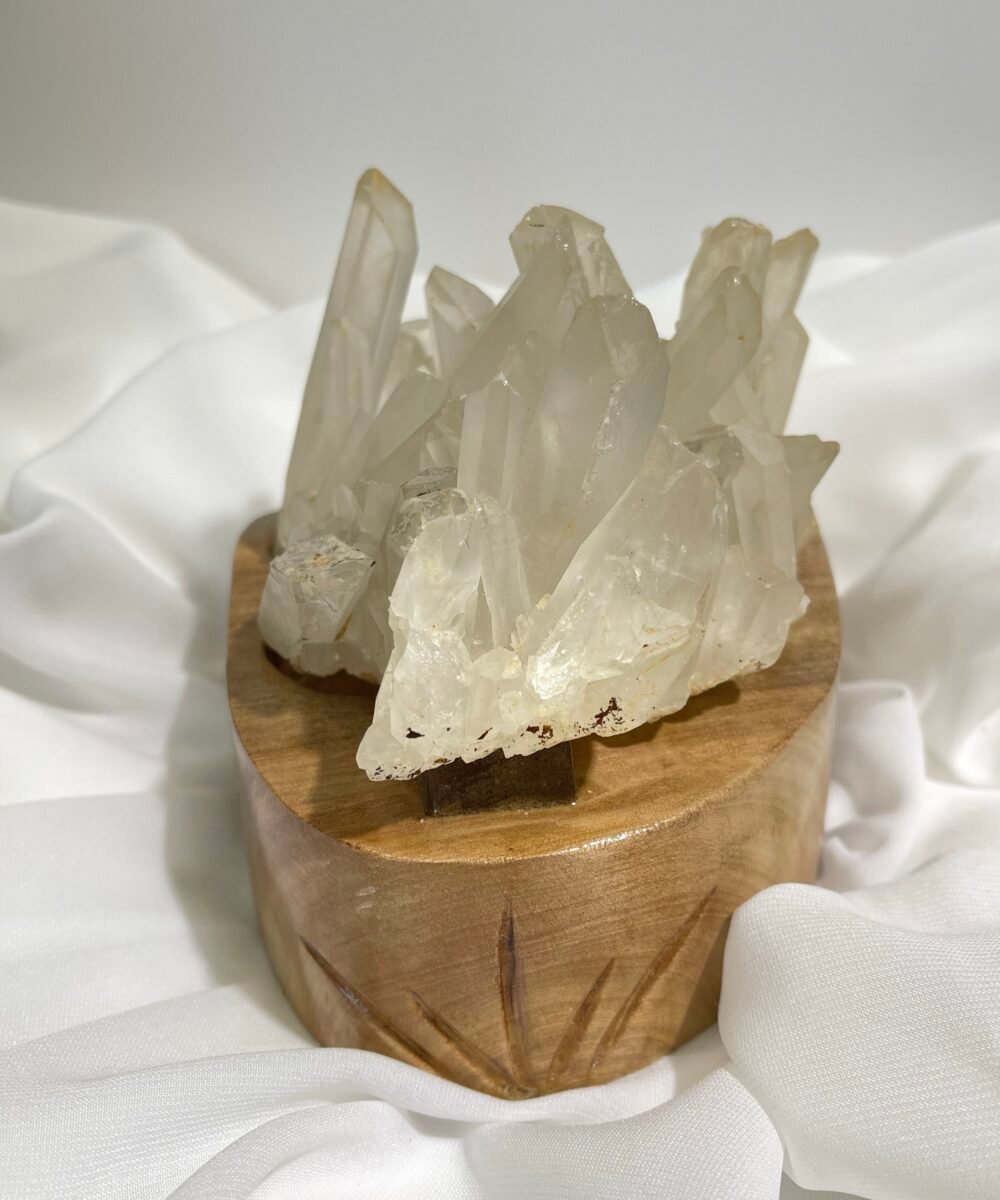白水晶簇,由很多單支水晶組成。白水晶在地底下、岩壁中形成並挖掘出來的最自然形態,成簇狀或片狀,水晶柱向外自然生長,指向四面八方,形成一個非常旺盛的、強力的能量體。