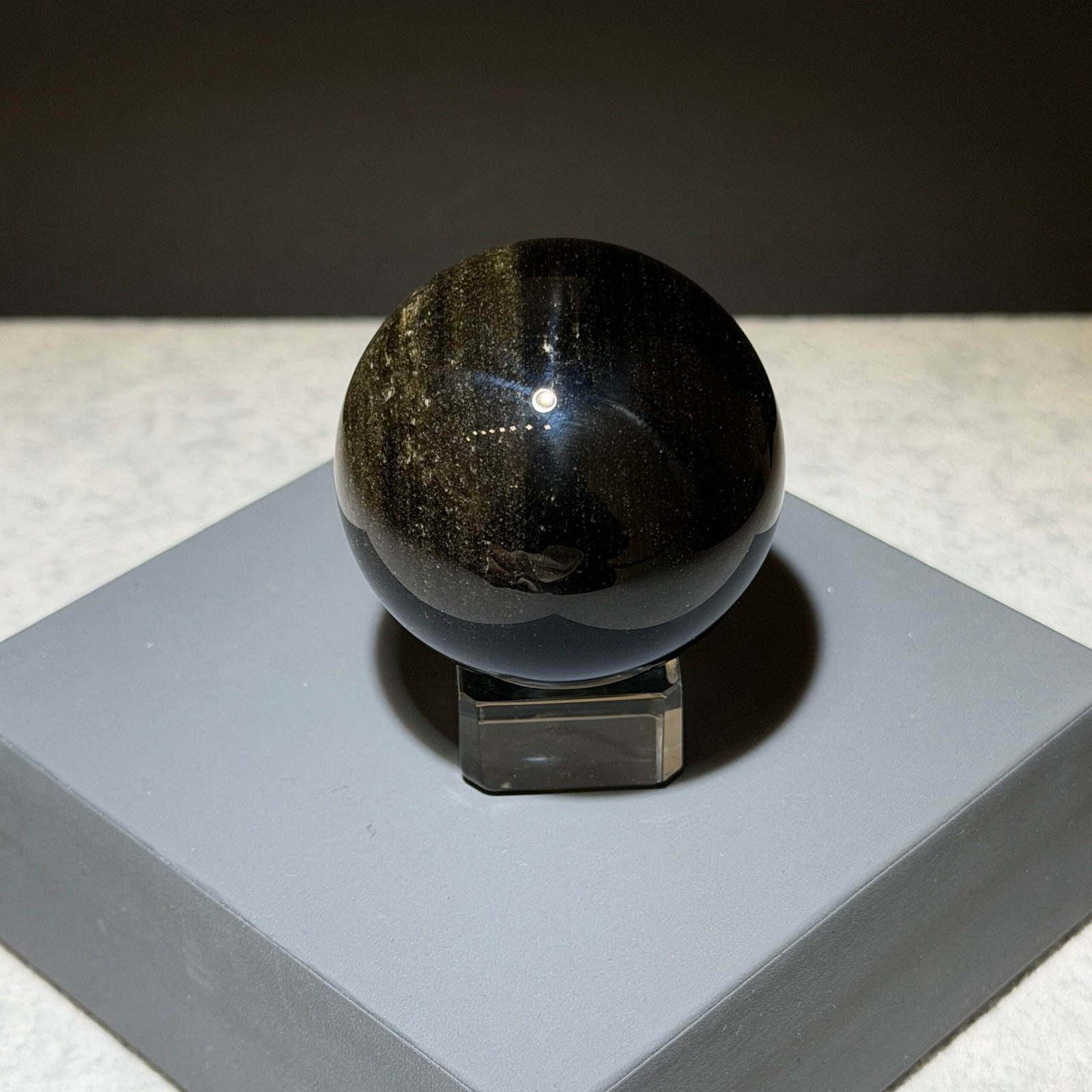 金曜石球以其深邃的黑色基底與閃耀的金色光澤聞名,是曜石家族中相當珍貴的一種。它被視為強力的防護石,能夠阻擋負能量、化解外在干擾,為佩戴者或空間提供堅實的能量屏障。