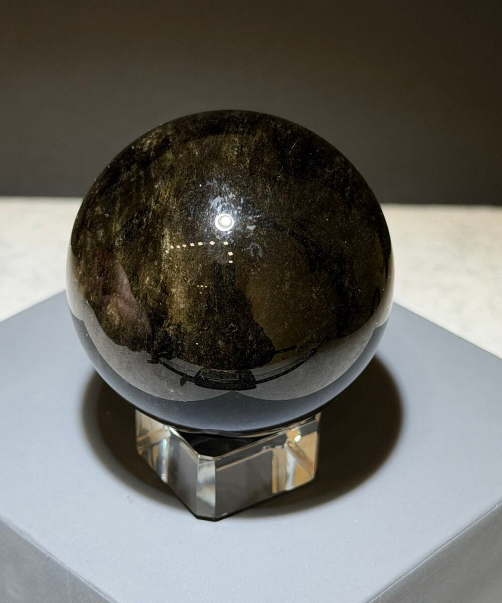 金曜石球以其深邃的黑色基底與閃耀的金色光澤聞名,是曜石家族中相當珍貴的一種。它被視為強力的防護石,能夠阻擋負能量、化解外在干擾,為佩戴者或空間提供堅實的能量屏障。