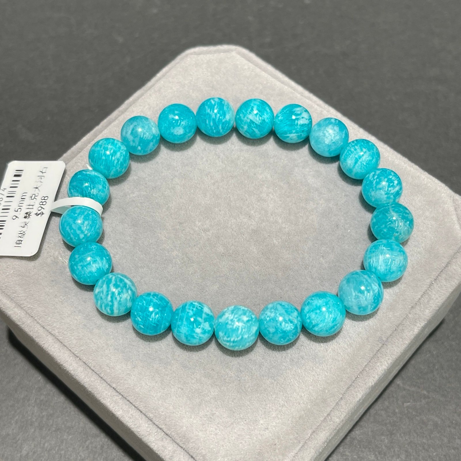莫桑比克產的天河石擁有獨特的斜白紋, 由於晶體結構亦會帶有微細閃光